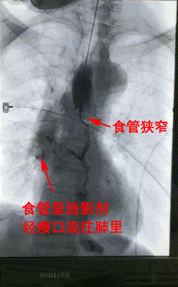 △術前DSA造影顯示:食管狹窄+食管氣管瘘。