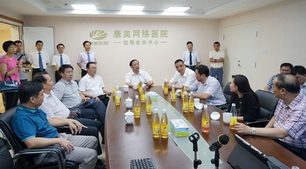 随後,王國強副主任一行來到康美網絡醫院遠程會診中心進行座談,詳細了解康美藥業互聯網+醫療戰略布局的建設進展情況。康美健康雲總裁彭少毅及其團隊對康美藥業互聯網醫療整體構建、項目進展進行了具體講解和演示。王國強副主任聽取彙報後指出,康美藥業作爲全國唯一的中醫藥信息化醫療試點平台單位,互聯網醫療平台建設卓有成效,探索出的網絡醫院、智慧藥房、智慧養老、健康管理等智慧醫療新模式,是積極探索創新醫療健康服務的典型代表,是推進智慧醫療,發展自動化、智能化健康信息服務的最好表現,值得在全國大力推廣。