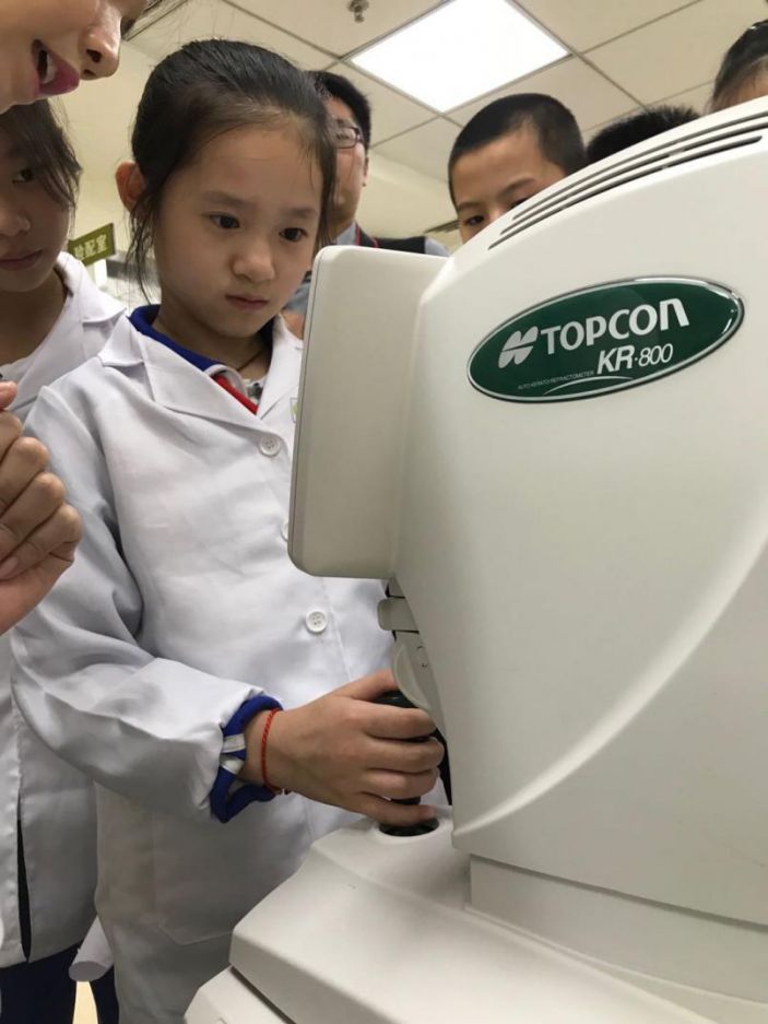 國家高級視光師謝文源老師首先爲學生們認真講解了眼球的結構及基礎眼病,近視遠視的成因以及防控知識。随後,學生們穿上了白大褂,在視光師蔡曉順老師的帶領下宣讀醫生誓言,上崗成爲了一名“眼科醫生”,親身走進眼科醫生及視光師的世界。在帶教老師的指導下,小醫生們仔細操作康美醫院各類尖端眼科設備爲“患者”做檢查。小醫生們在生動有趣的氛圍中,觀測了近視與正常眼底的區别,了解如何給患者做視力檢查、主導眼檢查、立體視圖和色覺檢查,以及電腦驗光檢查後如何取得屈光度數等。